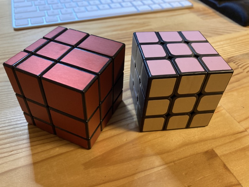 赤っぽい色のミラーブロックスと通常のルービックキューブだ。