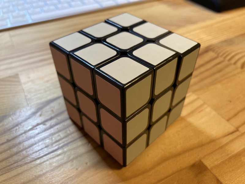 もうひとつのルービックキューブは普通のルービックキューブといえば普通だけど、色が変だ。黒を除き、あえて区別が付きにくい色を使ってあり、解く際に混乱しやすくしてある。
