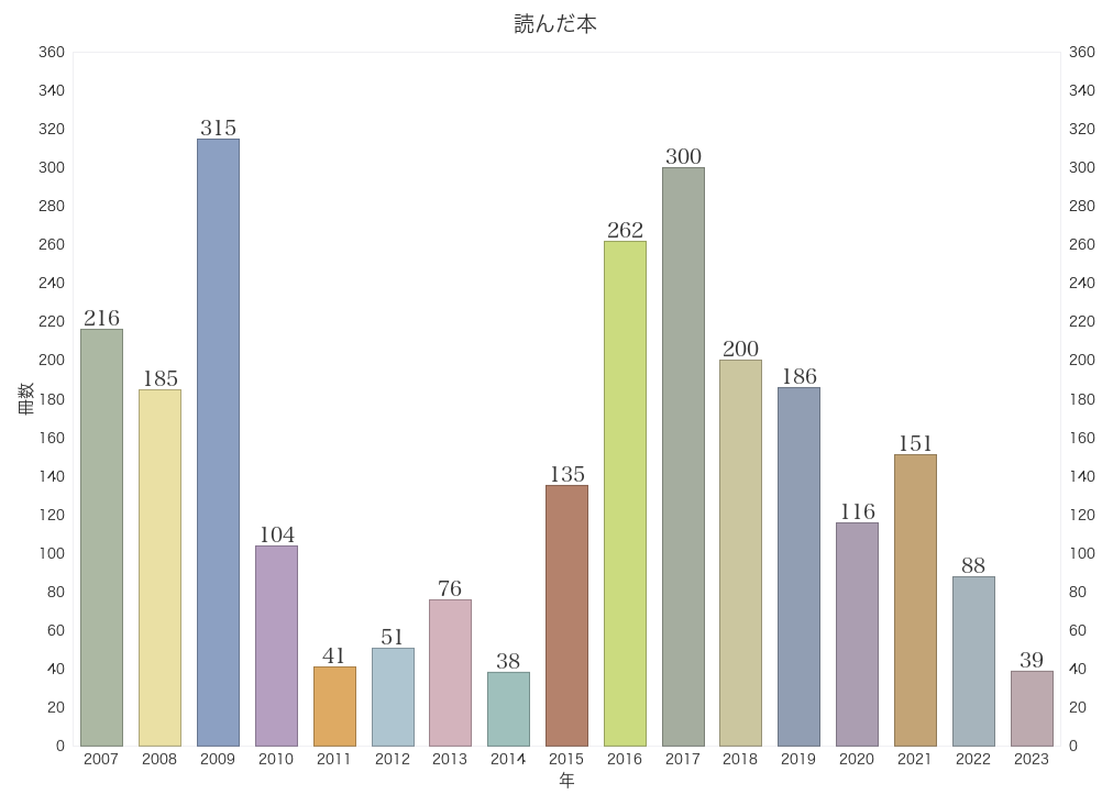 近年でも珍しく冊数がぐっと減っている。2023 年は 10 月から毎日1本映画を観ることにしたので、しばらく映画に集中することにしたことが関係しているのかもしれない。