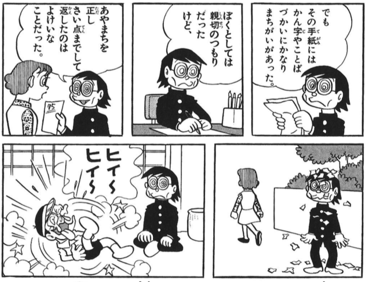 ラブレターを採点するところが『キテレツ大百科』の「失恋はラブミ膏」と似ている。