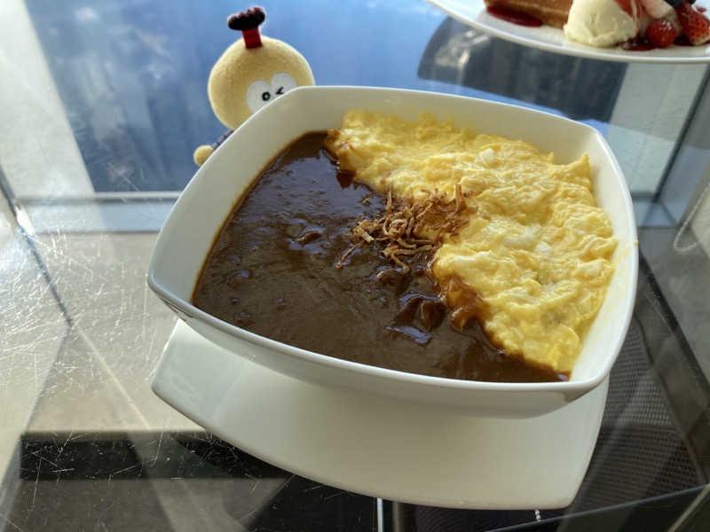 料理は「オムカレー」(1300 円)と「ストロベリーワッフル」(1200 円)にした。