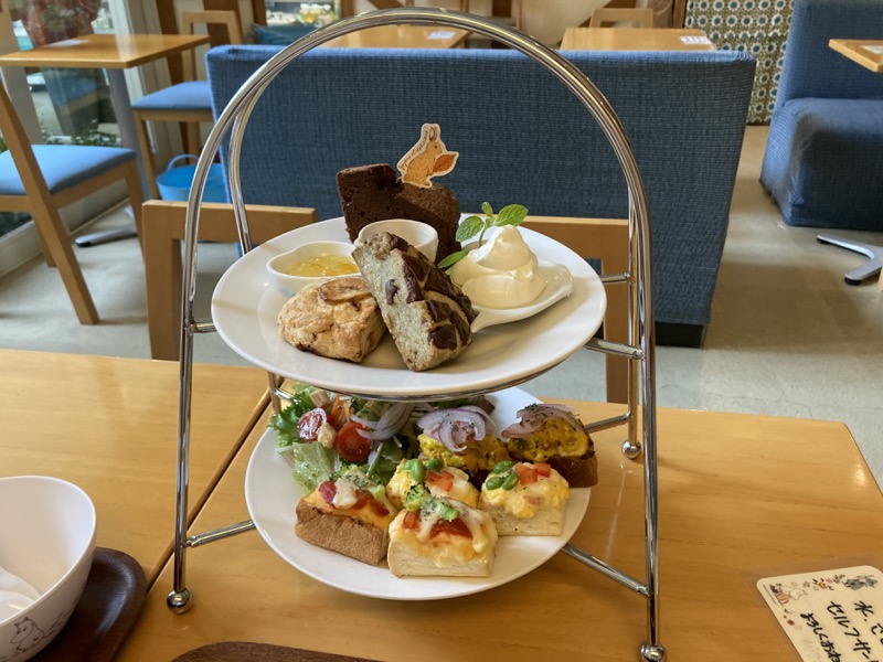 アフタヌーンティーセットは下段がサンドイッチとサラダ、上段がスコーン2つとシフォンケーキとなっている。1時間ほど前に軽く昼食を食べたばかりで、息子はシフォンケーキとアップルジュース、チョコレートマシュマロのみを食べていた。シフォンケーキには生クリームとはちみつ、ジャムをたくさん塗っていた。僕はその残りを食べたが、一人で食べるには多すぎた。店員さんがデザートは持ち帰り用に包んでくれると最初に言われていたが、全部無理して食べてしまった。やはり持って帰ればよかったかな。