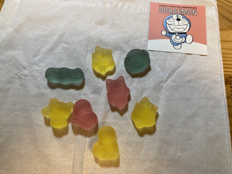 グミのおまけのステッカーは全 20 種類、グミの形は9種類。でもグミの味はグレープのみ。すべてのステッカーを集めるのにひたすらグレープを食べ続ける「修行」が待っているが、ファンならやるしかない。とりあえず5つ買ったら、ちょうど全て別のステッカーが当たった(キテレツ大百科はまだ出ていない)。グミにもコロ助が出てきた。