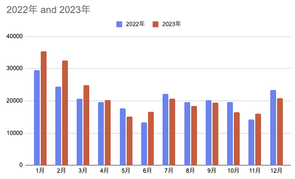 以下が 2022 年と 2023 年の同月の電気代を比較したものだ。2023 年1月から食器洗い機を使い始めたので1月から順番に比較すればいいので見やすい。