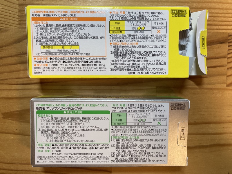 ただ缶のほうが「医薬品」なのに対し、この箱のものは「医薬部外品」となっており効き目が低いようだ。たしかに使ってみて実際に効き目が弱い気がする。軽い症状のときに使うといいのかもしれない。