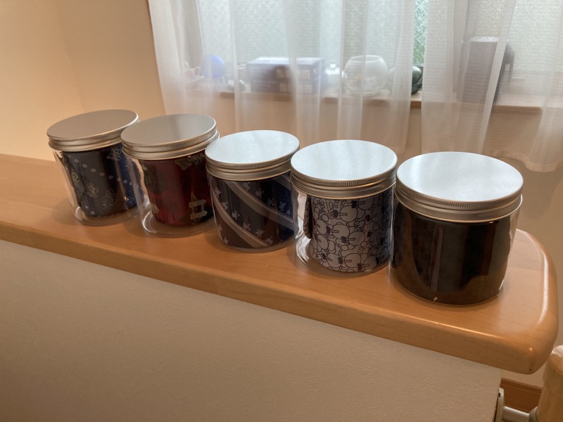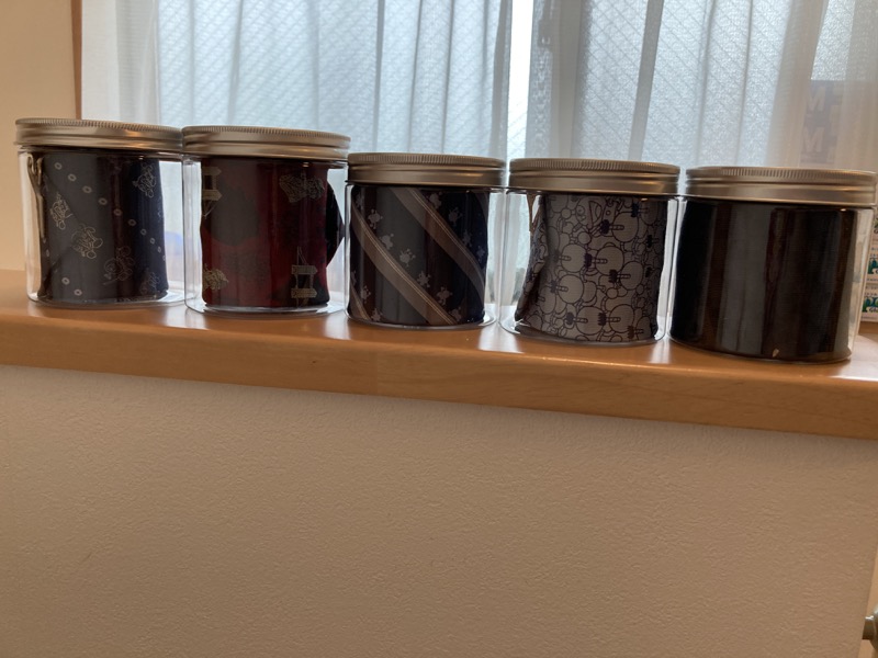 ネクタイケースにどんなものがあるか調べてみたら、筒状ケースに個別に入れるものがあるようだ。旅行用のようだが、家に長期保管するにも悪くなさそう。百円ショップにもあるらしい。