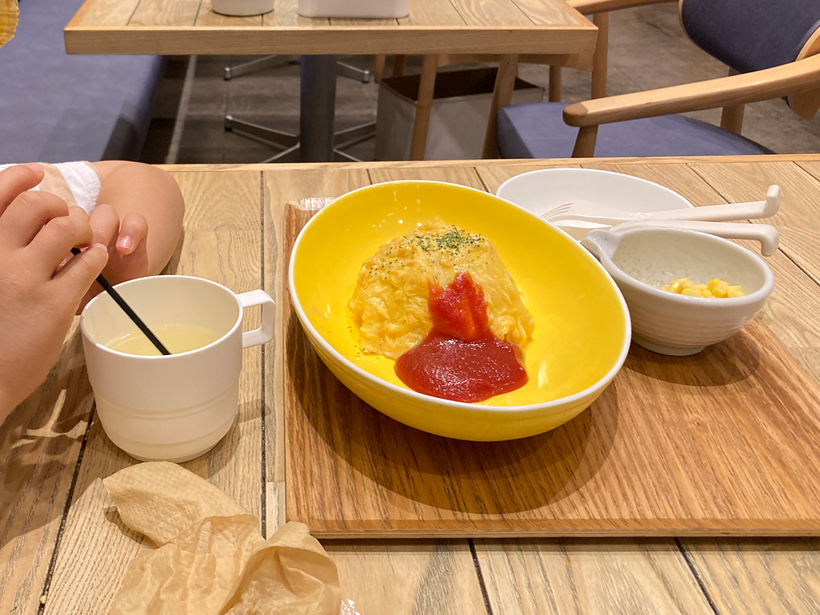 最初は普通にオムライスのセットを2つ注文しようとしたら、店員さんが子どもはオムライスセットが無料になるという。平日と土日祝の 15 時~ 21 時限定で、未就学児は子ども用のオムライスセットもしくはカレーセットが無料らしい。すばらしい。店員さんが教えてくれたことも嬉しい。