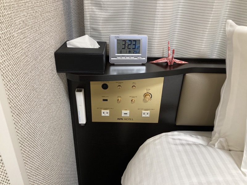 枕元のアメニティーやスイッチ。折り鶴がある。