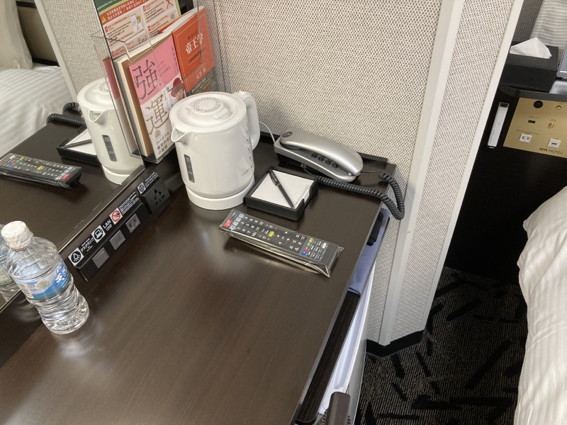 デスク上のアメニティーや電話。メモパッドは息子のお絵描きで使えた。