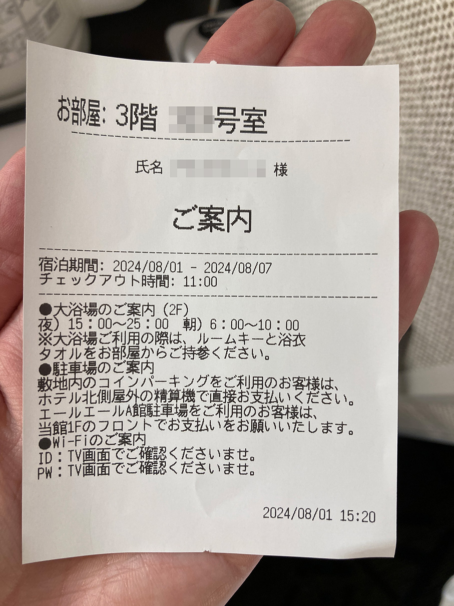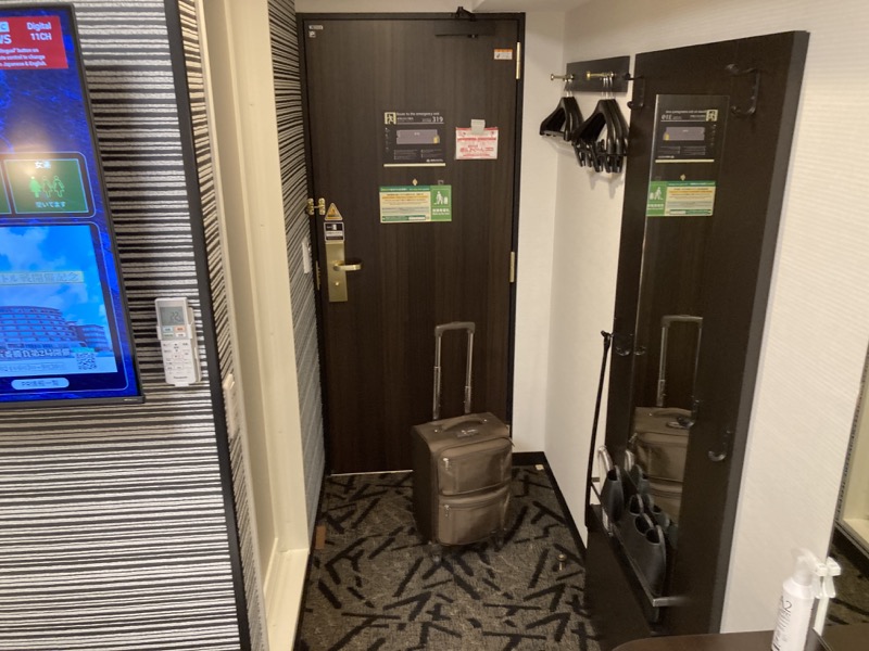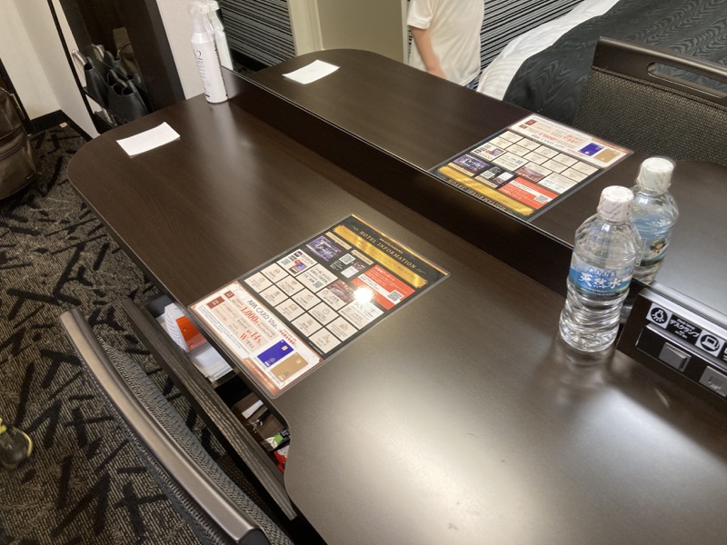 ロビーはかなり狭かった。1秒チェックインの端末に、アプリで表示する会員証の QR コードを読み込ませることで、カードのルームキーと部屋番号などが書かれたレシートのようなものが出てきた。たしかに1秒でチェックインできる。
