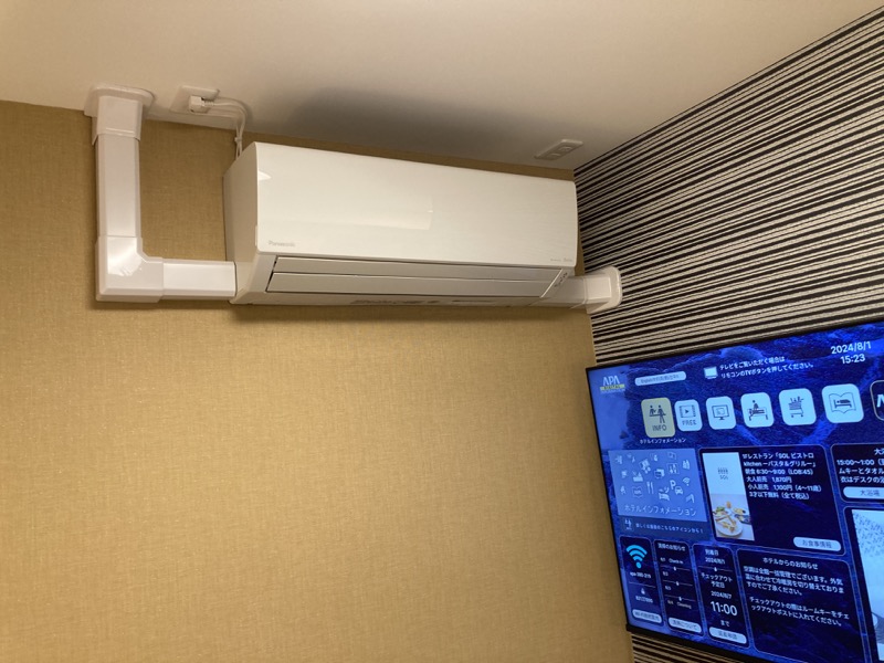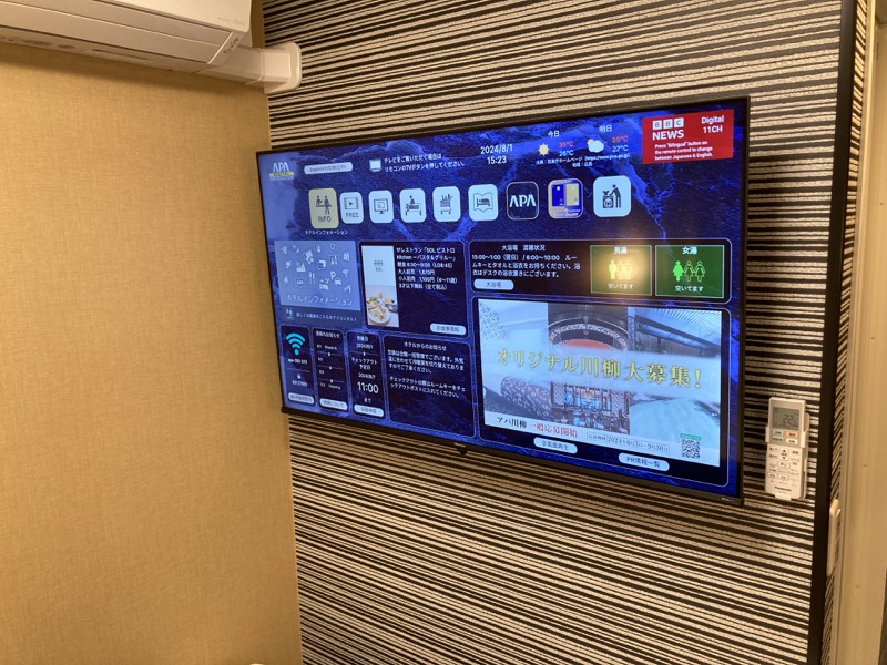 大きなモニター。WiFi の ID とパスワードなども表示されている。海外だとテレビに「ようこそ、ox 様」と名前が表示されたりするが、これだけ高性能なモニターでありながらそういう表示はない。