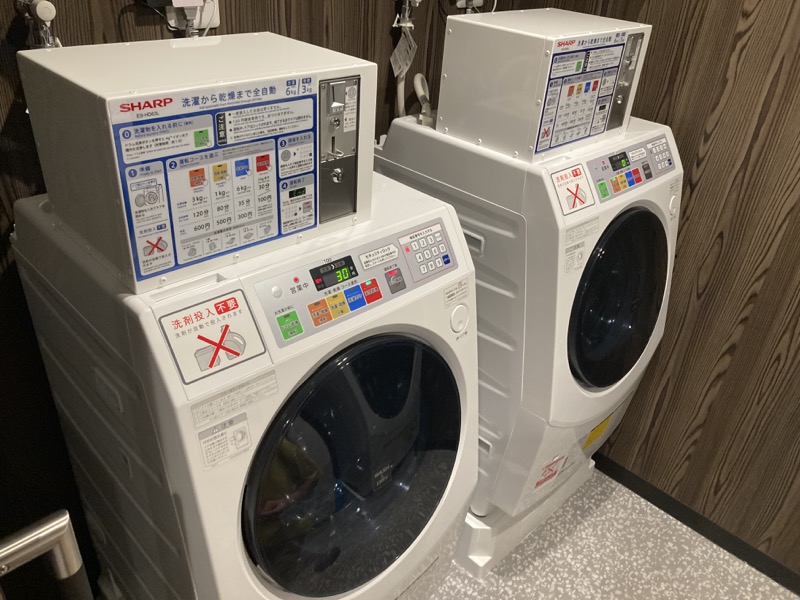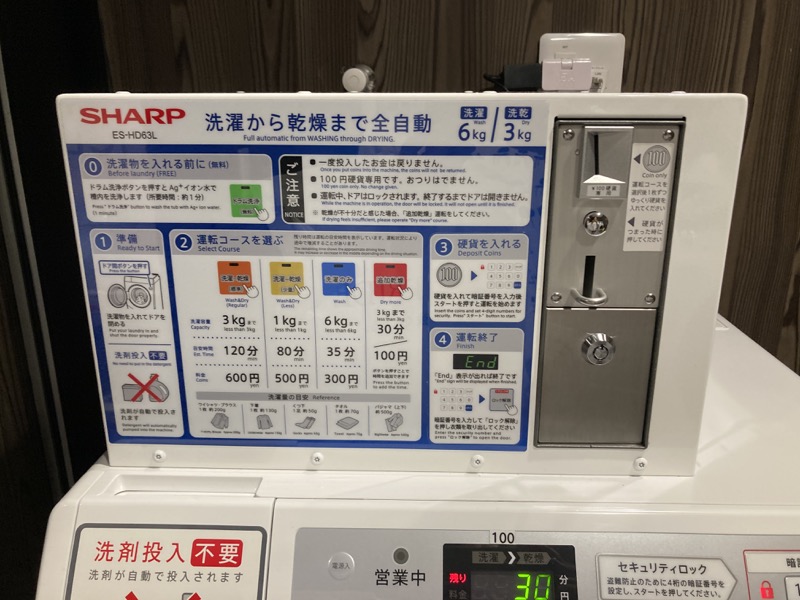コインランドリーはドラム式洗濯乾燥機が4つ。嬉しいのは洗濯前の1分間の内部洗浄機能があることと、洗剤が自動投入されるので用意不要だということだ。わざわざ家から洗剤を持って来なくてよかった。