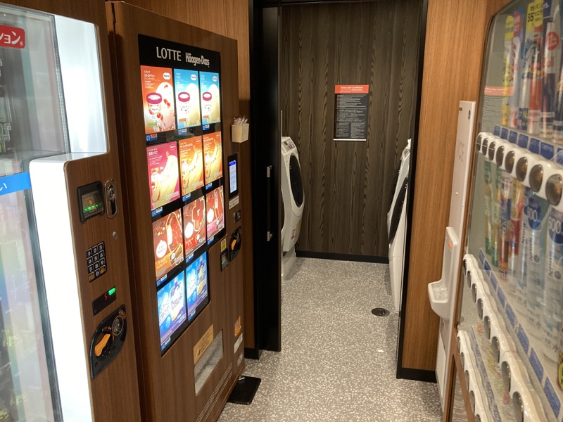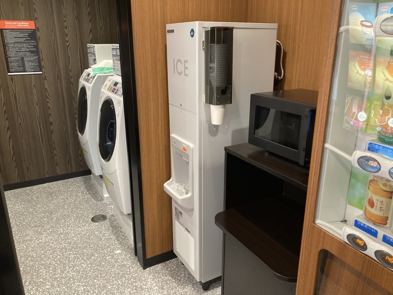 手前からドリンクの自動販売機、電子レンジ、製氷機、コインランドリー。