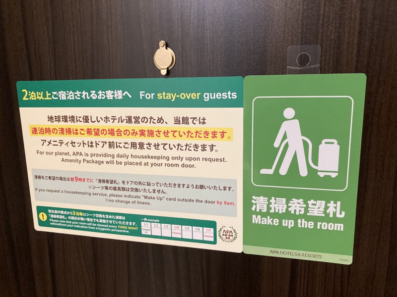 連泊する場合、部屋のドアの外に「連泊希望札」というマグネットのプレートを貼らないと掃除やシーツの交換をしてもらえない。ゴミも捨てられない。僕は毎日掃除をしてもらいたいので毎日プレートを貼っていたが、1度貼り忘れたことがあった。すると寝巻きとバスタオル、ハンドタオルがビニール袋に入れられてドアノブに掛けられるだけとなった。掃除しないことがデフォルトなのは嫌だな。せめて毎日プレートを貼るのではなく一括申請できるようにしてほしい。