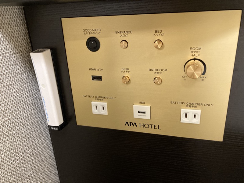 枕元のスイッチ。部屋のライトが調光できたり、USB 端子があったり、HDMI で iPad 等をモニターにミラリングできるのは嬉しい。