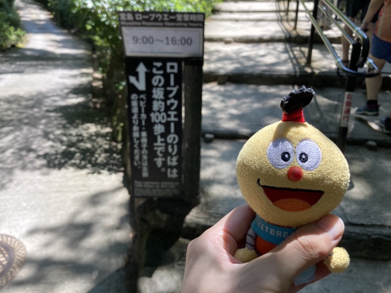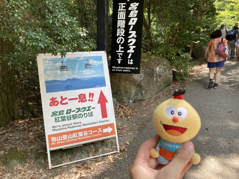 まず息子は人力車に乗りたいと言い出した。僕だって乘ったことがないのでこれもチャレンジだ。宮島に付いてすぐの場所にいた人力車のお兄さんに声をかけてロープウェイ乗り場まで乗せてもらうことにした。30 分 9000 円。高いと思ったけど、まあ記念だからいいだろう。お兄さんは楽しい人だったし、途中ずっと観光案内をしてくれる。それと人力車は意外と乗り心地がいい。滑らかに進むし、そよ風が吹く。屋根もあるので快適な観光ができた。PayPay 払いに対応していた。人力車での会話は録音していたので、あとで聞き返すと楽しかった。