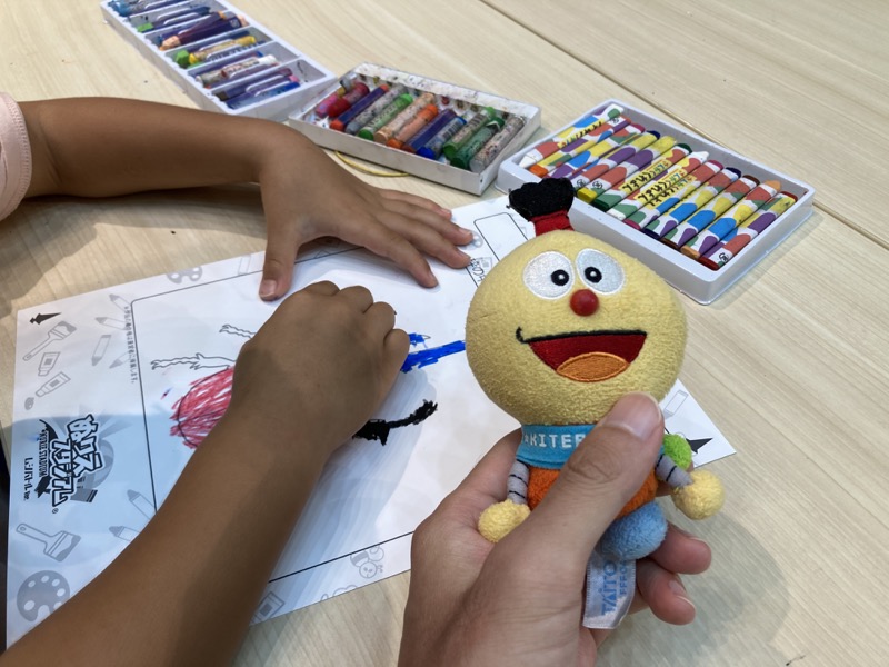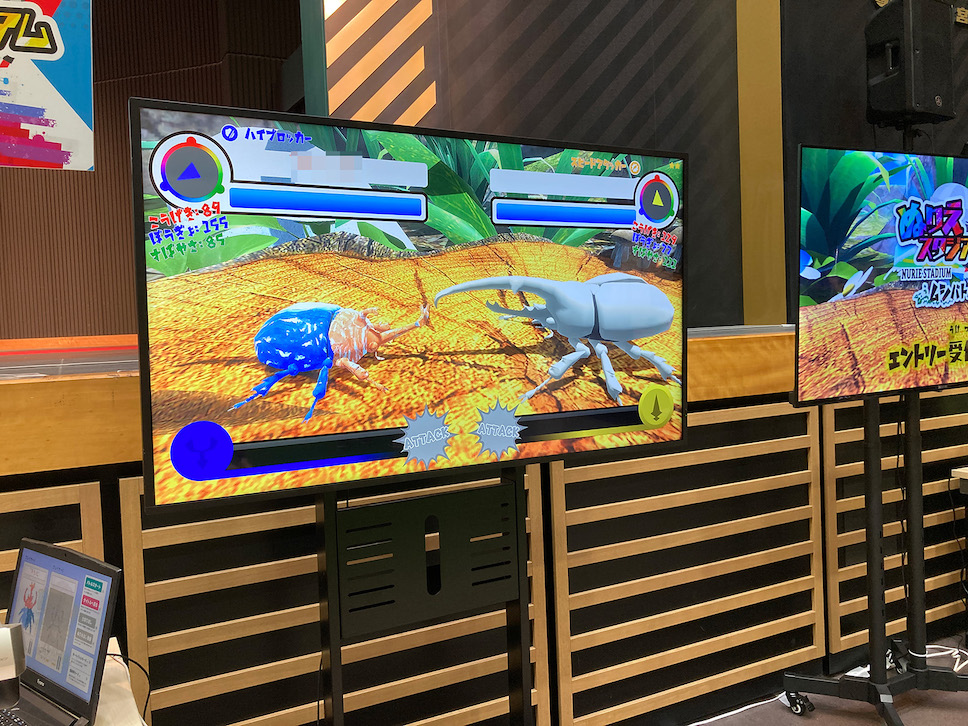 さらに「ぬりえスタジアム」という別の塗り絵があり、それをスキャナーで読み取ることで昆虫同士がバトルするゲームができる。Nintendo Switch のヌンチャクリモコンを使うものだ。息子は8回ぐらいやっていた。一人やたら全力で体全体を動かしてゲームをしていてちょっとお父さん恥ずかしかったぞ。同時にその塗り絵はペーパークラフト用に変換して厚紙にプリントアウトしてもらえる。会場もしくは自宅でペーパークラフト作品が作れるようになっていた。