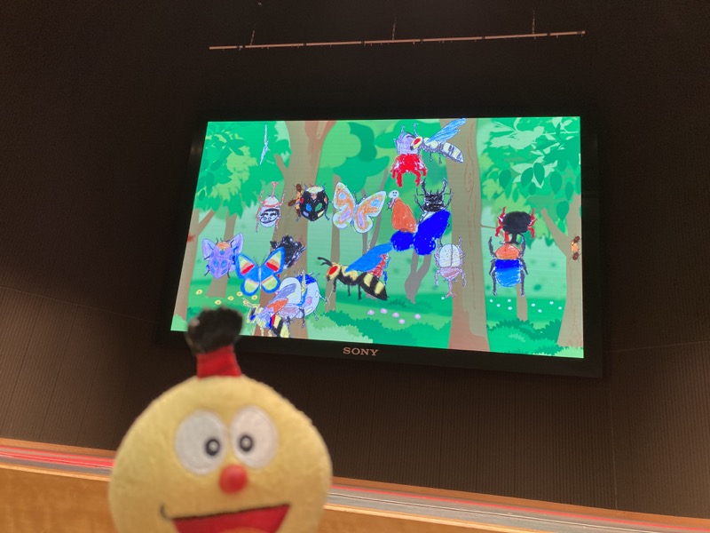 他にもいろいろな昆虫の標本が展示されていたり、「フライングペイント」という塗り絵コーナーでは自分の塗り絵をスキャナーに読み取ってもらうことで大画面に動く昆虫として投影してもらえるものもあった。息子は3回ぐらいやっていた。
