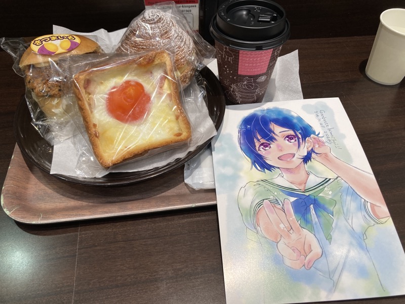 映画のあとパン屋で。入場者特典は1〜3週で毎週変わる。現在も3週目の特典が配布されていた。