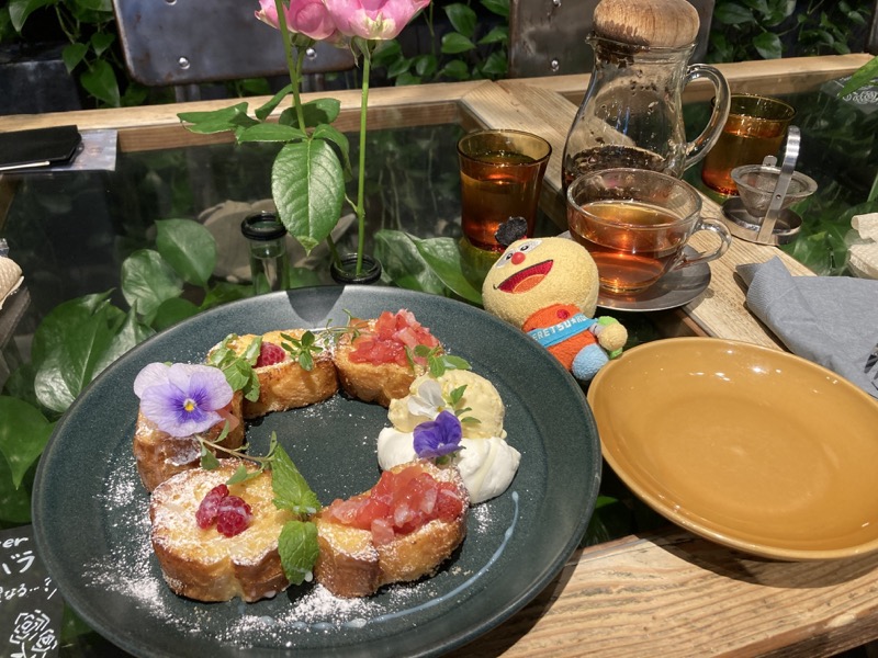 料理はフレンチトーストとハーブティーを注文。フレンチトーストには食べられる花が添えられてみて食べてみたが、花の味は普通だった。フレンチトーストはなかなかおいしかった。盛り付けもかわいい。