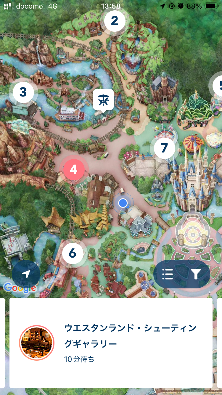 マップ上でアトラクションやショップを選択すると、そこからトップメニューに戻る方法が最初分からなかった。いちいちアプリを再起動していたが、単にマップ上で空白部分をタップすればメニューが出てくると分かった。こういう細かいインターフェースは感覚的に使いやすくしてほしい。