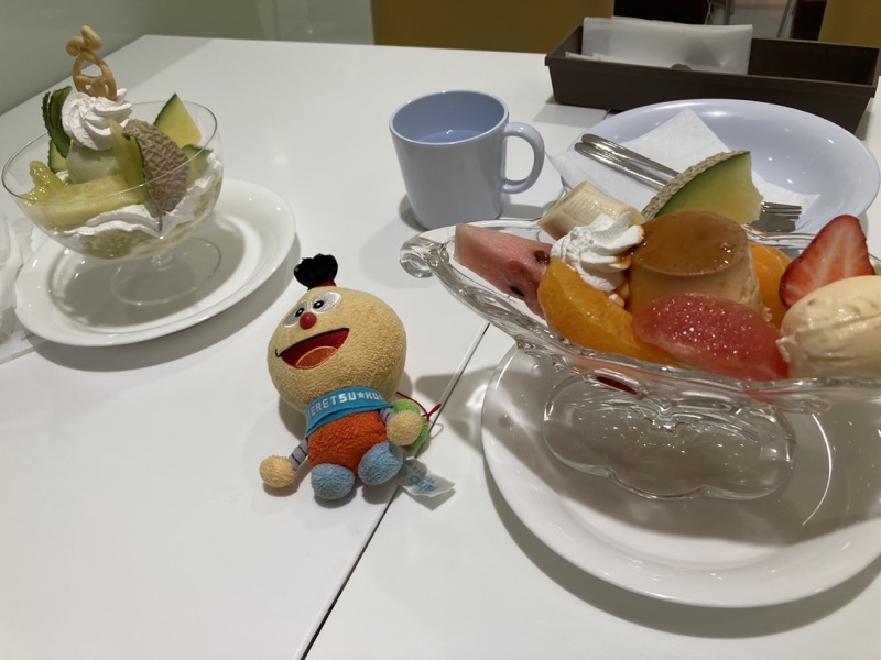 息子はマスクメロンパフェ(2,750 円)、僕はプリン・ア・ラ・モード(1,540 円)を注文した。やっぱりパフェがいいよね。息子用に皿は低めのものにしてもらえた。