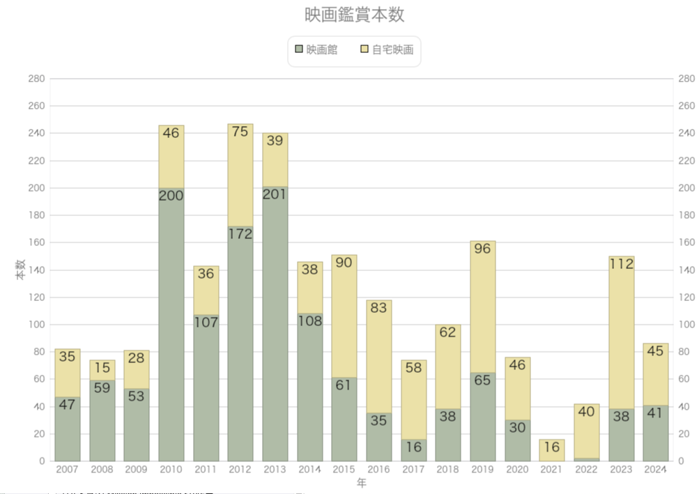グラフで年ごとの本数変化も観てみよう。2023 年から映画館通いがまたペースアップしている。今年は『ミッション:インポッシブル/ファイナル・レコニング』がある。またたくさん通うことになるだろう。