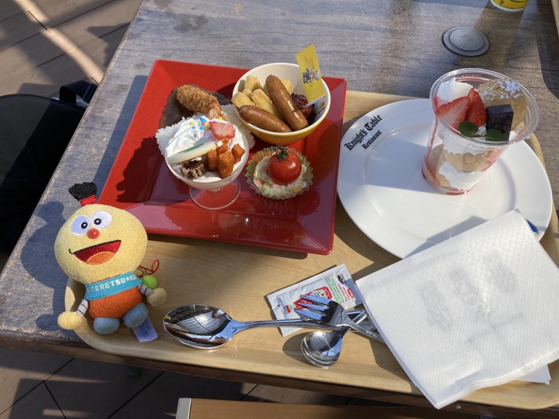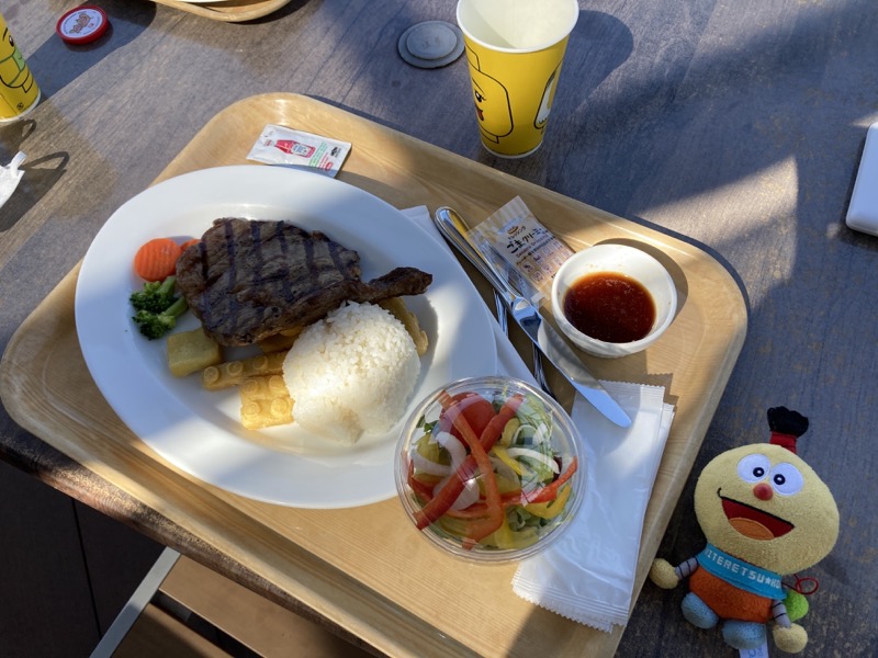 14:00 頃になった遅い昼食は「ナイト・テーブル・レストラン」で食べた。少し寒かったが、目の前にジェットコースターが見えるテラス席で食べた。僕は「グリルステーキセット(ドリンクバー付き)」(3,800 円)、息子は「キッズブリックカレーセット」(1,000 円)、二人で「カップシュークリーム」(800 円)を食べた。でも値段のわりにあまりおいしくない。冷えている。息子のカレーも冷えていたので、息子は口をつけていなかった。これなら去年レゴランドで食べたハンバーガーのほうがよかった。