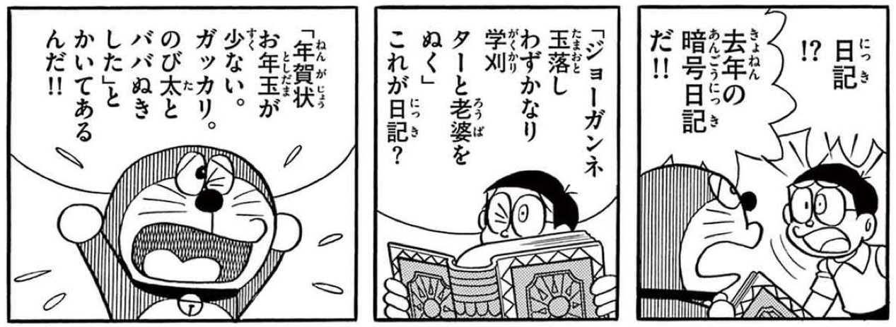 『藤子・F・不二雄大全集 ドラえもん』の第 13 巻 p484 で、ドラえもんが暗号で日記を書いていることが明らかになった。