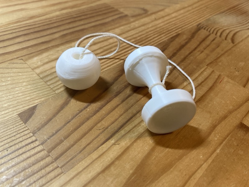 息子が気軽に遊べるおもちゃを作りたくなった。息子はけん玉はまだ難しい。そこで、皿が二つだけのシンプルな形の「フィンガーけん玉」を作ってみた。
